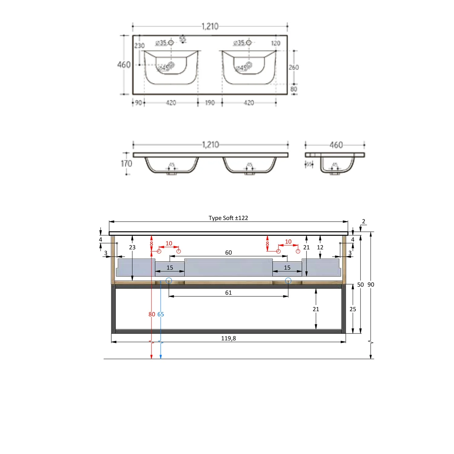 - mit 2 Hahnlöchern mittig und 2 Überläufen