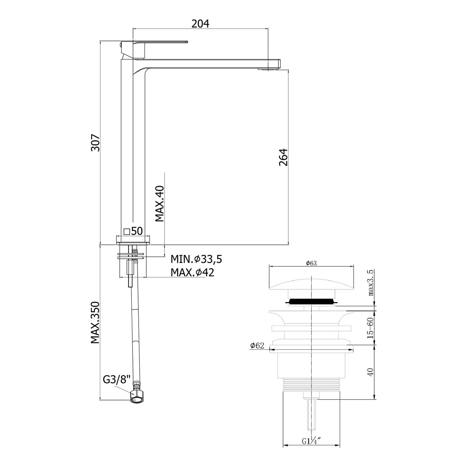 pianura Giulia Waschtisch-Einhebelmischer, wassersparend XXL inkl. Pop Up Ablaufventil