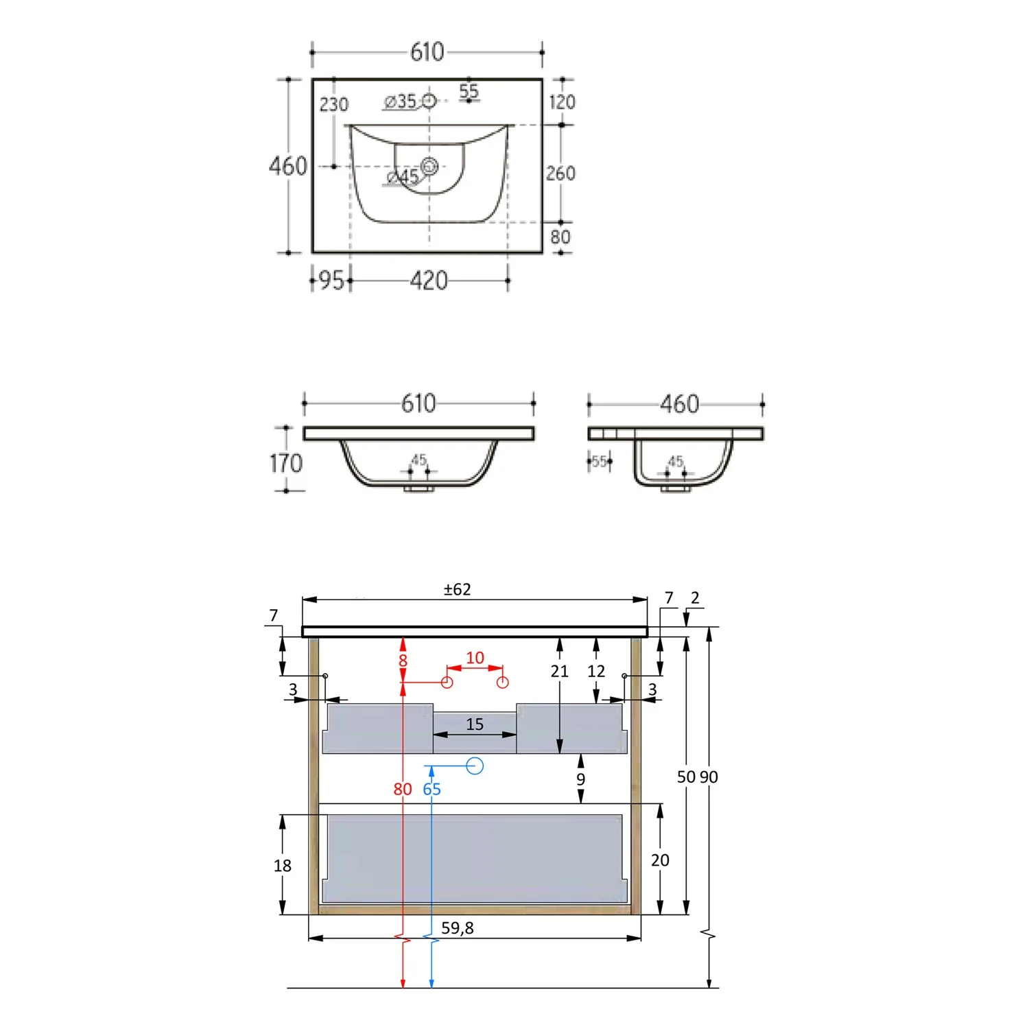 - B: 59,8 T: 45 H: 50 cm