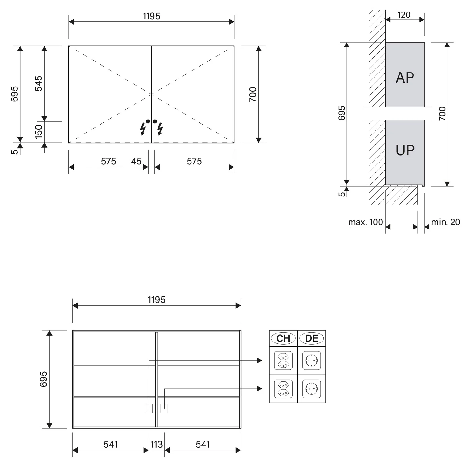 Schneider EASY Spiegelschrank ELC1 120/2/0/SD 119,5 x 70 cm, 2 Steckdosen, DE