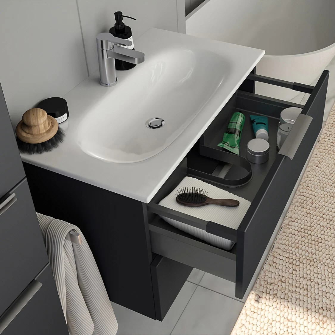 Kombinieren Sie das Design eines Markenwaschtischs mit einer attraktiven Stauraumlösung der Kollektion Living 2.0.
