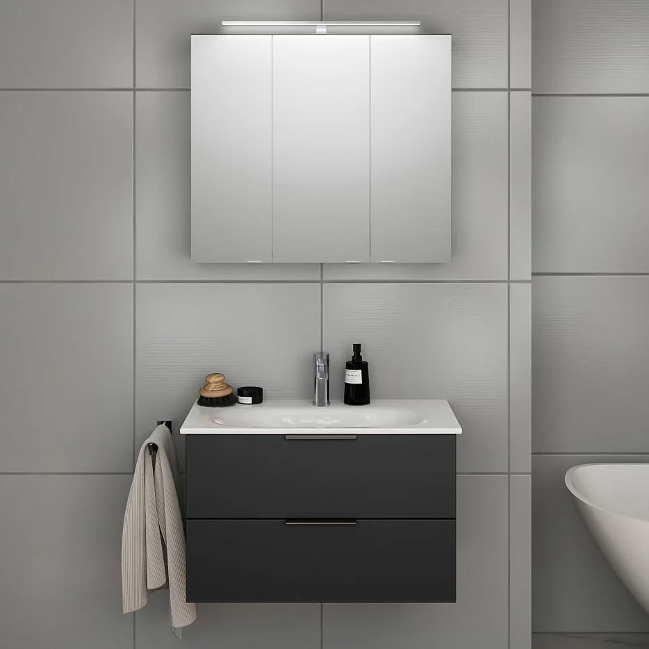 Erhältlich in verschiedenen, zeitgemäßen Dekoren und ausgestattet mit modernem, aufgesetztem Griff aus gebürstetem Edelstahl, verbindet Living 2.0 zeitloses Design mit maximaler Funktionalität. Je nach Waschplatzbreite sorgen großzügige Auszüge oder Türen für optimalen Stauraum – übersichtlich, griffbereit, stilvoll. Ein Spiegelschrank mit LED-Aufsatzleuchte komplettiert das Möbelset.
