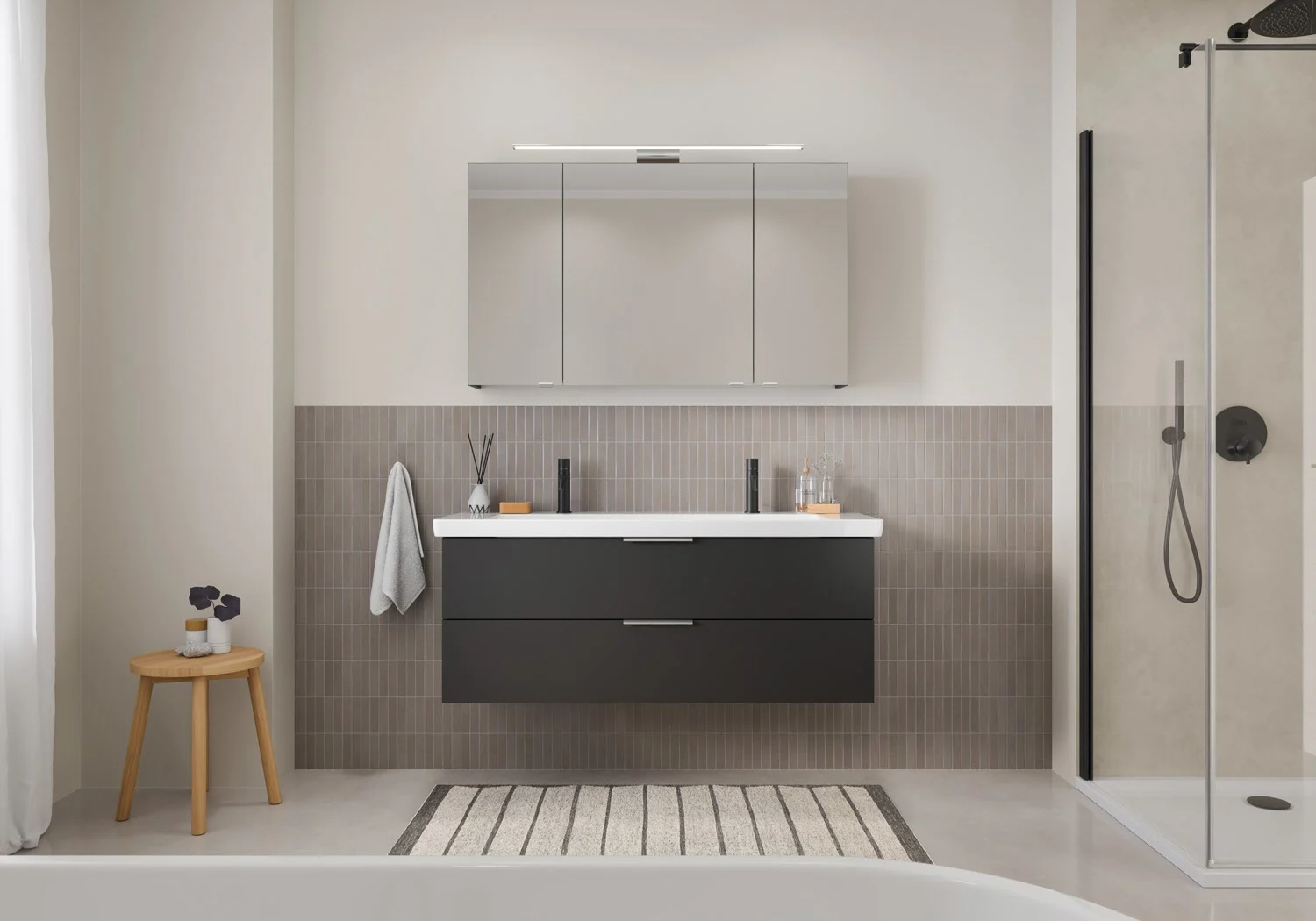 Der Spiegelschrank der Kollektion überzeugt durch seine durchdachte Funktionalität und eine moderne Ausstattung. Mit klarer Linienführung und praktischen Details bietet er nicht nur Stauraum, sondern auch eine optimale Ausleuchtung für den täglichen Gebrauch – ideal zur Ergänzung der Waschtischunterschränke der Kollektion Living 2.0.