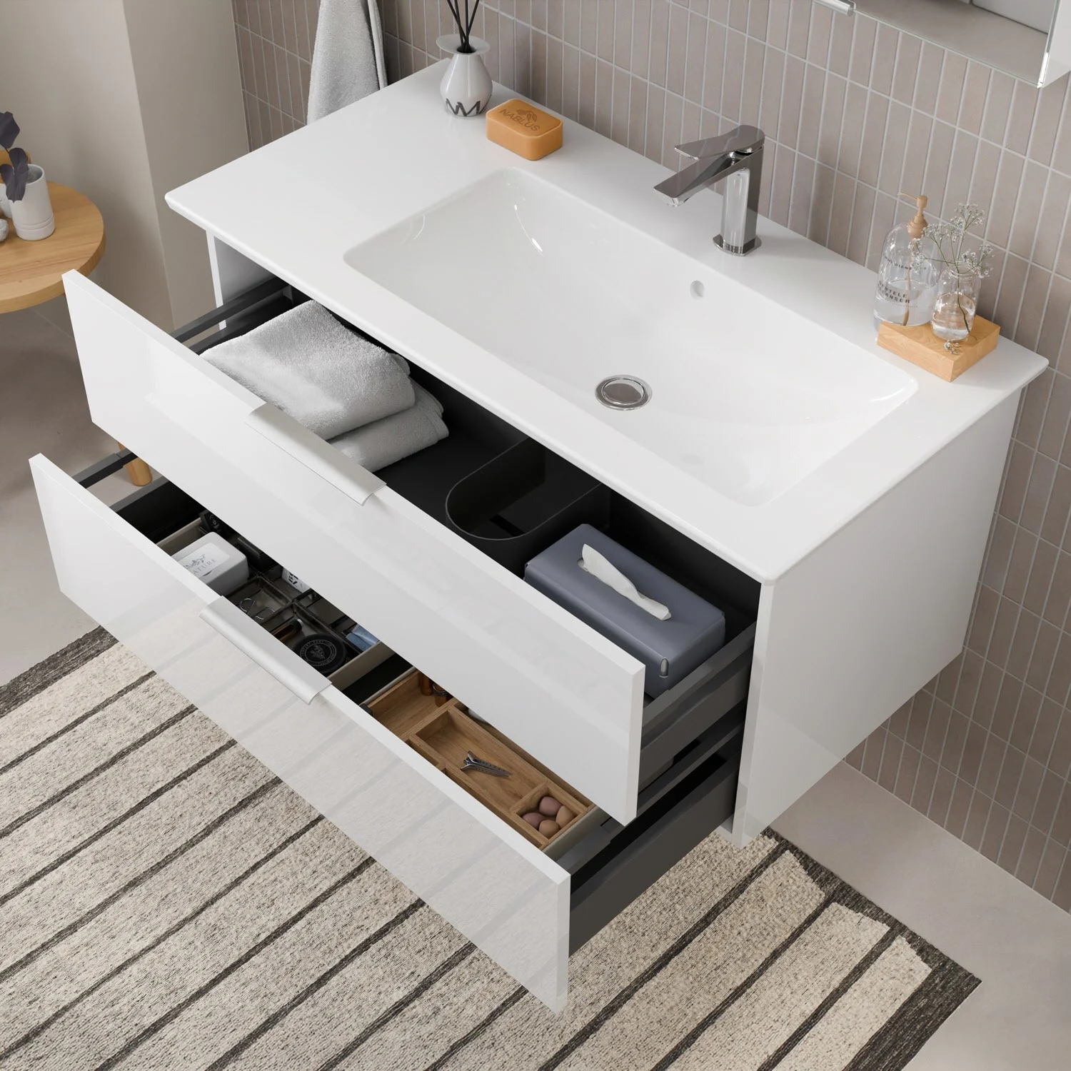 Flexibel. Passgenau. Stilvoll. – Die Badkollektion, die sich Ihrem Waschtisch anpasst!