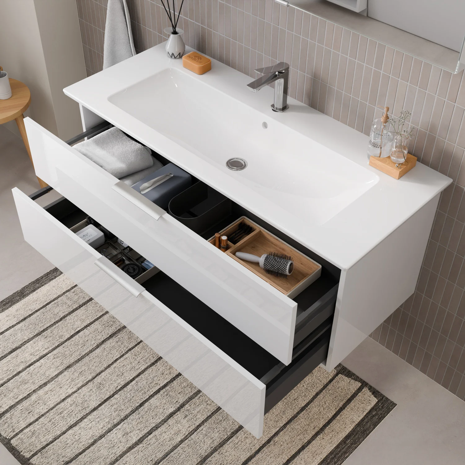 Flexibel. Passgenau. Stilvoll. – Die Badkollektion, die sich Ihrem Waschtisch anpasst!