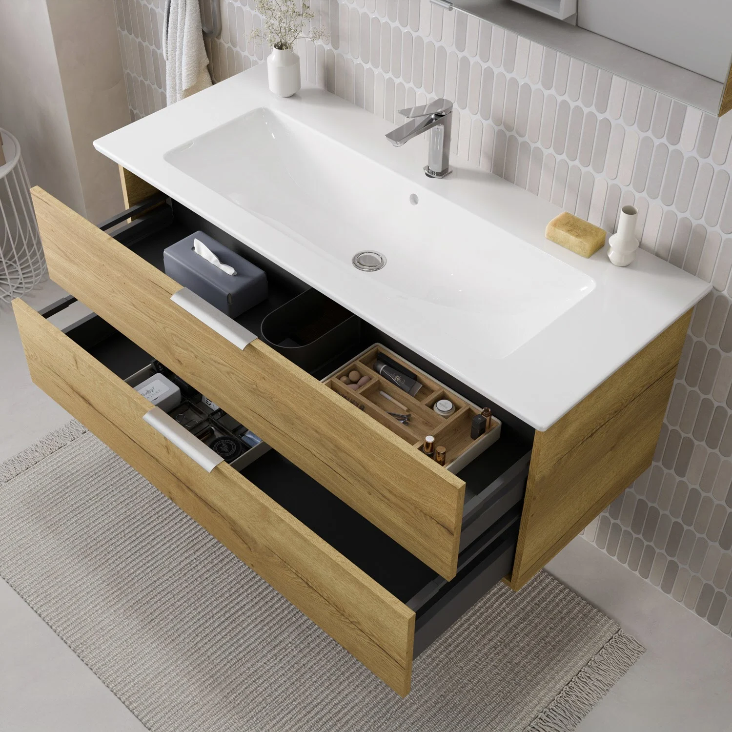 Erhältlich in verschiedenen, zeitgemäßen Dekoren und ausgestattet mit modernem, aufgesetztem Griff aus gebürstetem Edelstahl, verbindet Living 2.0 zeitloses Design mit maximaler Funktionalität. Je nach Waschplatzbreite sorgen großzügige Auszüge oder Türen für optimalen Stauraum – übersichtlich, griffbereit, stilvoll. Ein Spiegelschrank mit LED-Aufsatzleuchte komplettiert das Möbelset.