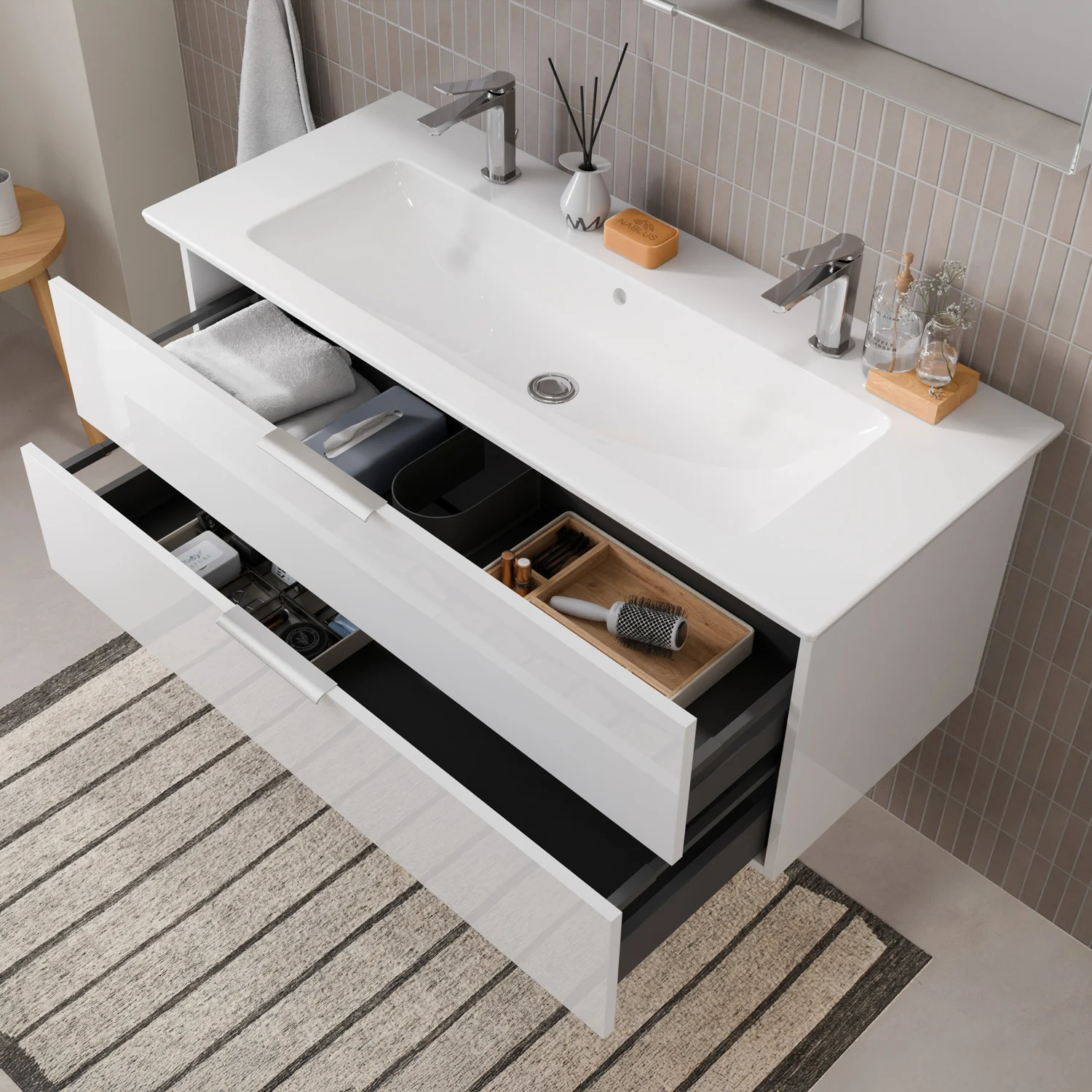 Kombinieren Sie das Design eines Markenwaschtischs mit einer attraktiven Stauraumlösung der Kollektion Living 2.0.