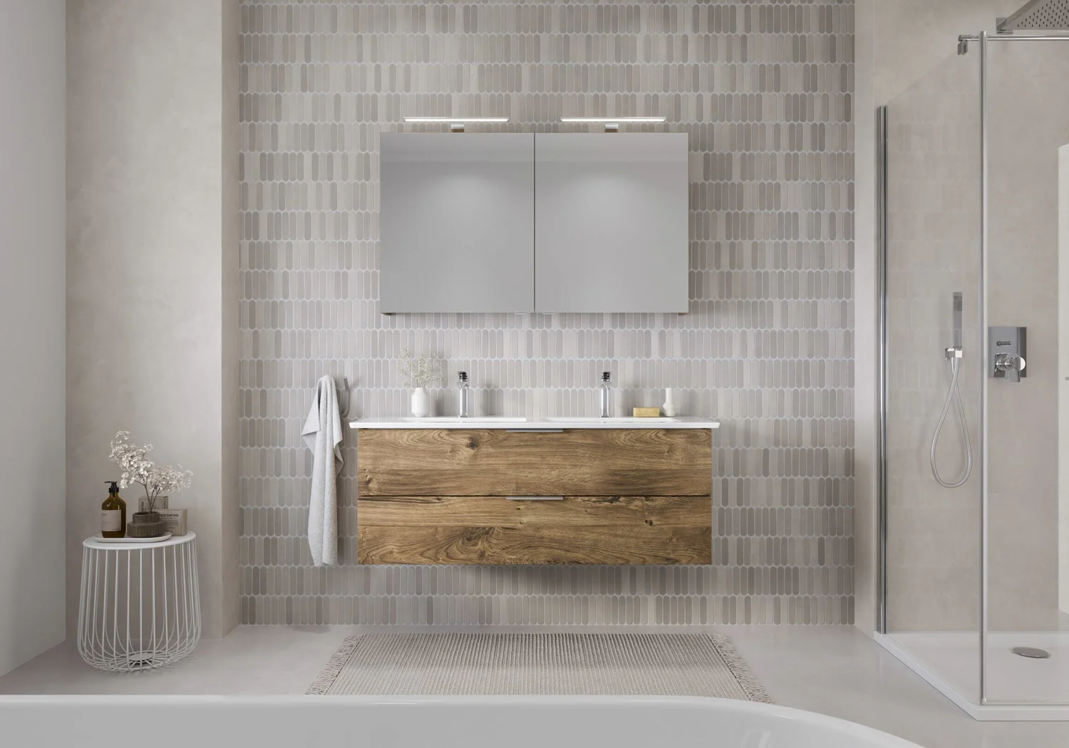 Erhältlich in verschiedenen, zeitgemäßen Dekoren und ausgestattet mit modernem, aufgesetztem Griff aus gebürstetem Edelstahl, verbindet Living 2.0 zeitloses Design mit maximaler Funktionalität. Je nach Waschplatzbreite sorgen großzügige Auszüge oder Türen für optimalen Stauraum – übersichtlich, griffbereit, stilvoll. Ein Spiegelschrank mit LED-Aufsatzleuchte komplettiert das Möbelset.