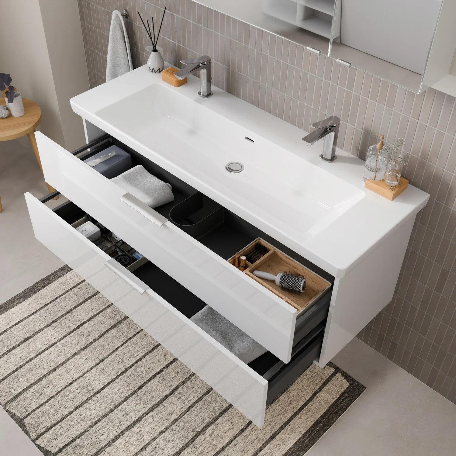 Sie haben bereits einen Waschtisch in Ihrem Bad montiert und wünschen sich mehr Stauraum? Erhältlich in verschiedenen, zeitgemäßen Dekoren und ausgestattet mit modernem, aufgesetztem Griff aus gebürstetem Edelstahl, verbinden die Living 2.0 Waschtischunterschränke zeitloses Design mit maximaler Funktionalität. Je nach Waschplatzbreite sorgen großzügige Auszüge oder Türen für optimalen Stauraum – übersichtlich, griffbereit, stilvoll. Für noch mehr Stauraum ergänzen Sie einen Spiegelschrank oder Hochschrank im passenden Dekor.