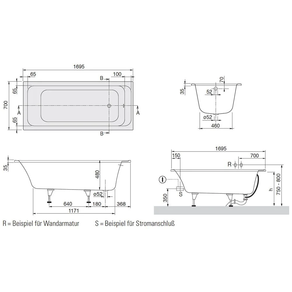 Villeroy & Boch Architectura Solo Badewanne 170 x 70 cm, Combipool Comfort, Technik Position 1