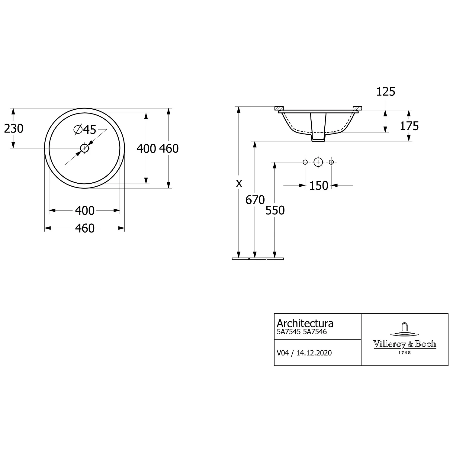 Villeroy & Boch Architectura Unterbauwaschbecken 45 x 45 cm rund, ohne Überlauf, ungeschliffen