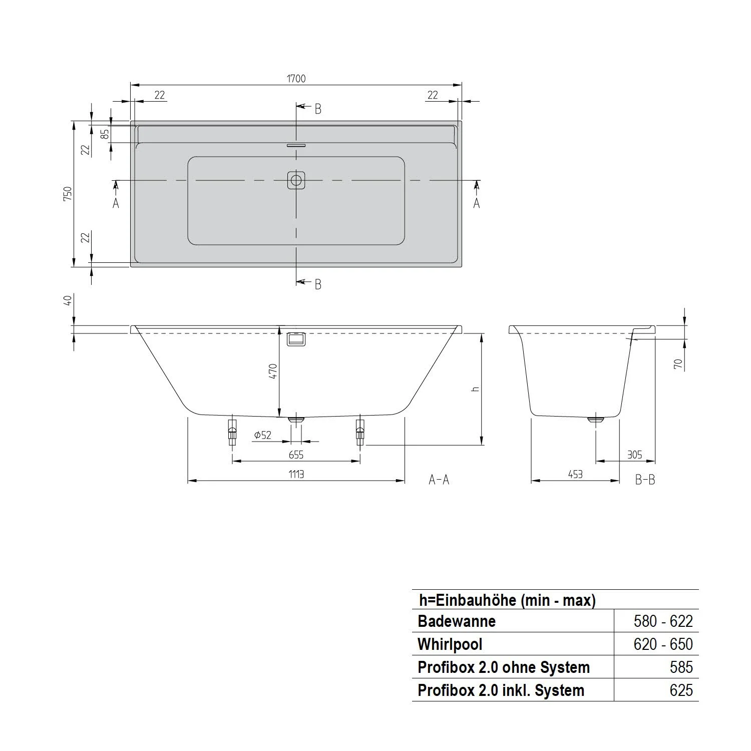 - h=Einbauhöhe (min - max) Whirlpool: 62 - 65 cm