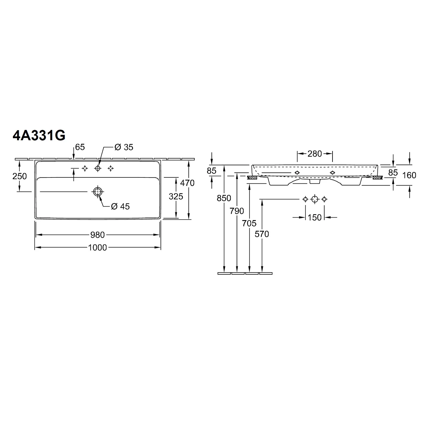 - Rechteckiger Waschtisch mit sehr feinen Wänden