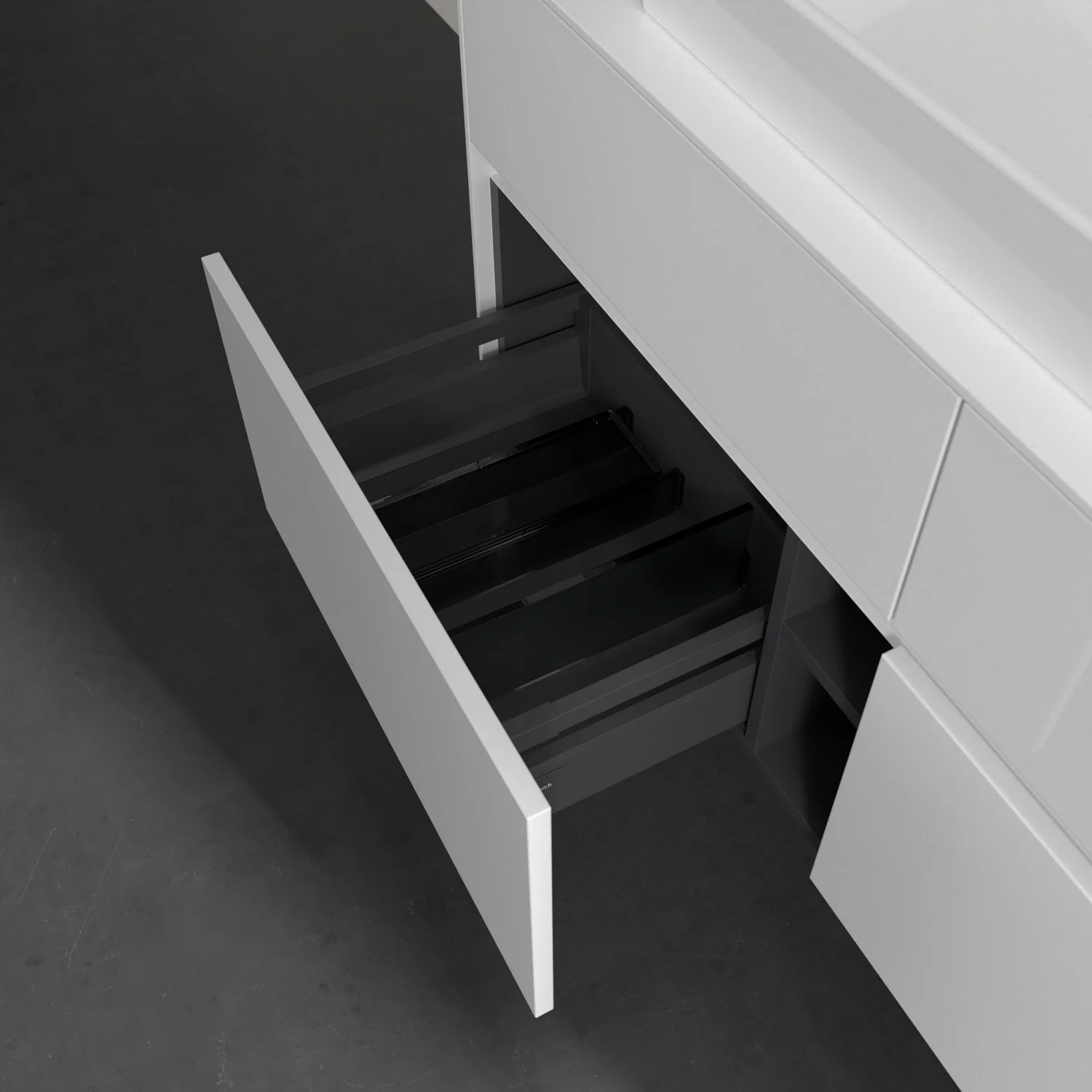 Stauraumwunder im zeitgemäßen Design: Der Villeroy & Boch Waschbeckenunterschrank aus der Collaro Kollektion eignet sich besonders für Familienbäder und bietet genau den Platz, der dort benötigt wird. Eine integrierte Griffleiste sorgt für eine schlichte, moderne Front. Im Inneren bietet das Möbelstück mit vier Auszügen erstaunlich viel Komfort – ermöglicht durch großzügiges Platzangebot und integrierte Antirutschmatten. Variabel setzbare Glasabtrennungen und mitgelieferte Accessory Boxen sorgen für den nötigen Überblick. Dank SoftClosing und Selbsteinzug lassen sich die Auszüge nach der Nutzung lautlos schließen.