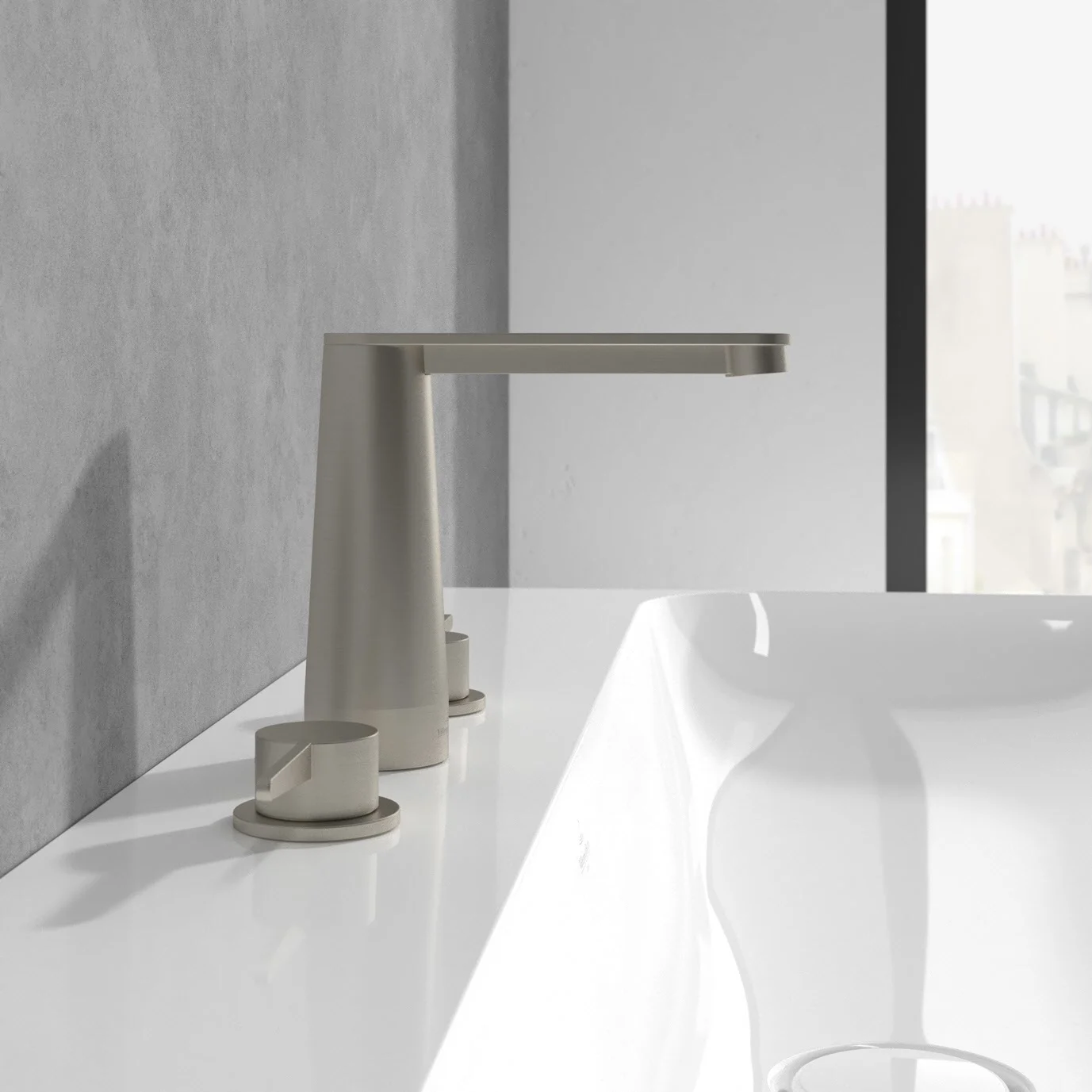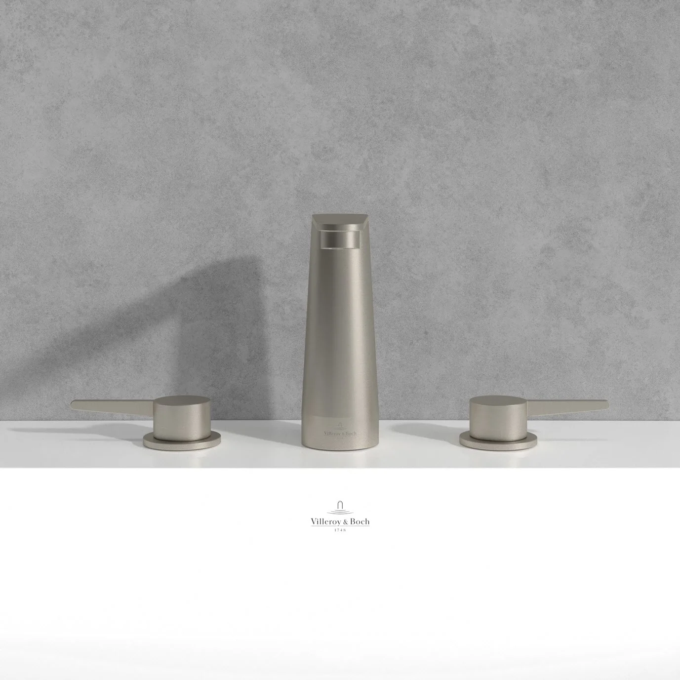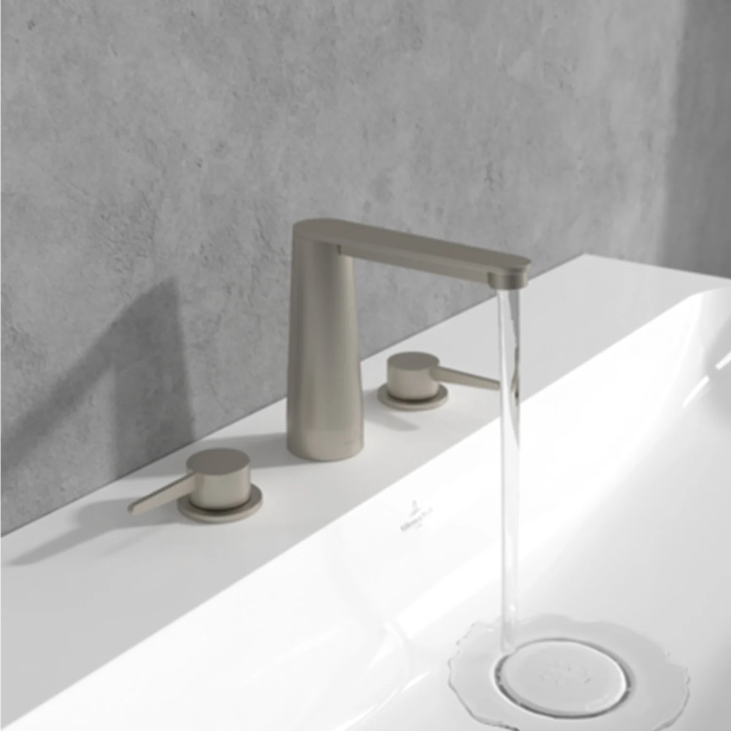 Die Villeroy & Boch Dreiloch-Waschtischarmatur aus der Conum Kollektion ist qualitativ hochwertige Armatur und Designobjekt zugleich. Das skulpturale und konische Aussehen von Conum führt zu einem wirklich einzigartigen Charakter. Und auch funktional punktet die Standarmatur. Denn sie glänzt mit einer komfortablen Höhe, die genügend Platz zwischen Auslauf und Waschbecken schafft. Über die beiden seitlich positionierten Hebel wird durch Drehen der kristallklare Wasserstrahl aktiviert. Durch den Verzicht von beigesetzter Luft ist er besonders leise und vermeidet unerwünschte Wasserspritzer.