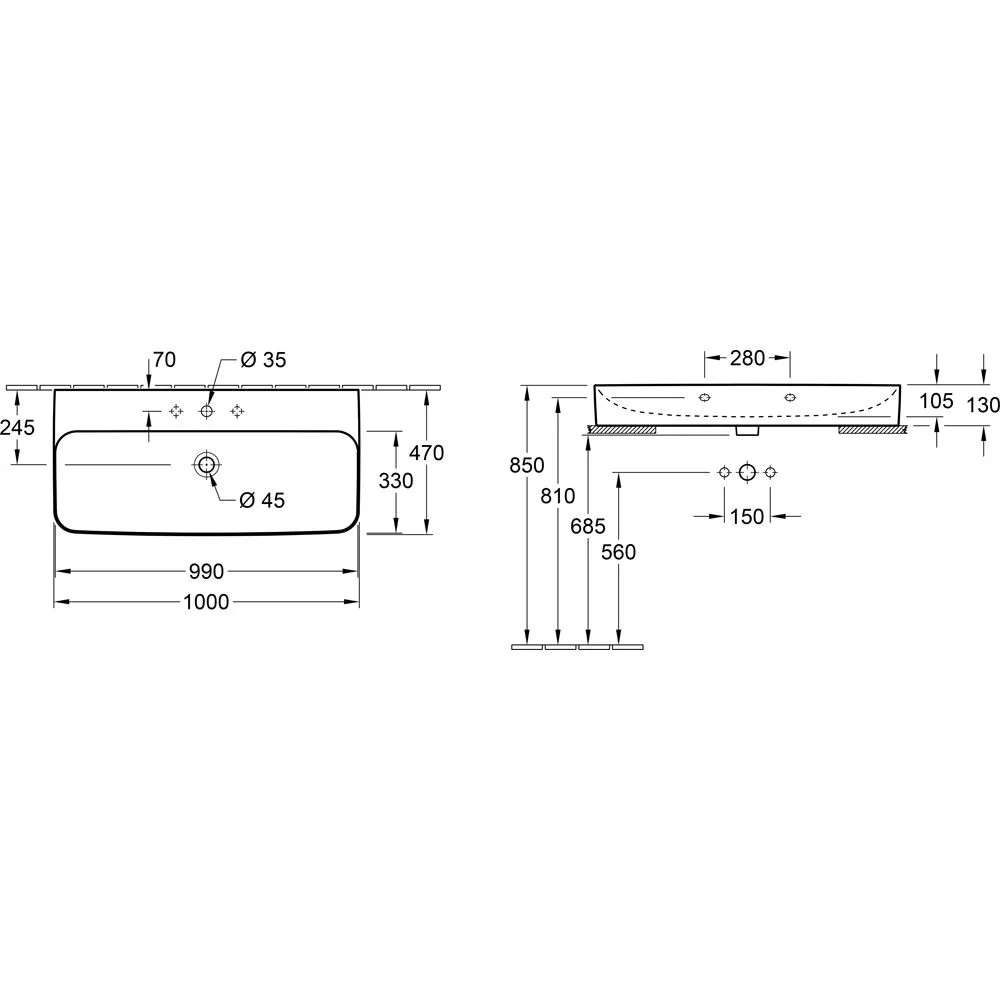 Villeroy & Boch Finion Aufsatzwaschtisch 100 cm mit Hahnloch, mit ViFlow Überlauf und Unterseite geschliffen