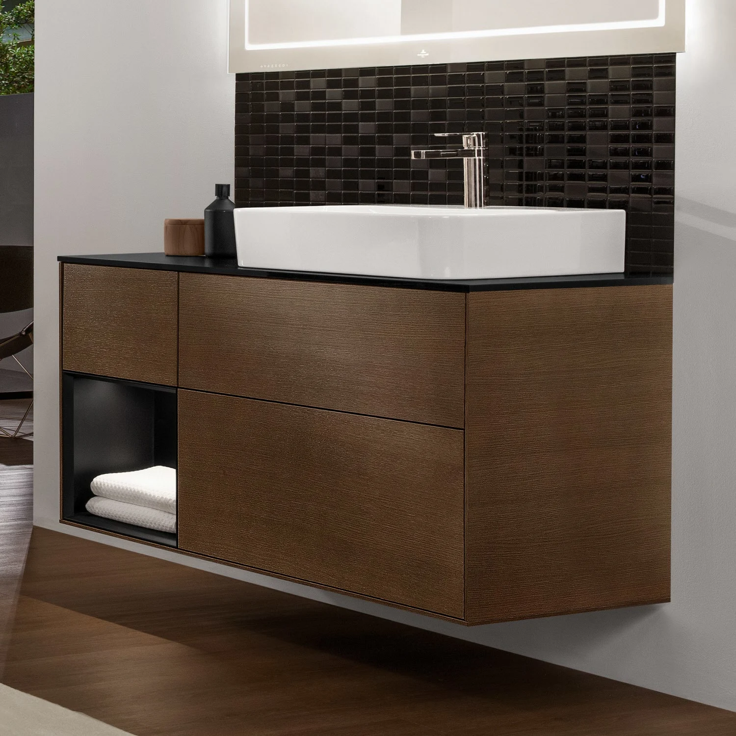 Villeroy & Boch Finion Waschtischunterschrank 120 cm mit Regalelement links, Abdeckplatte, Wandbeleuchtung