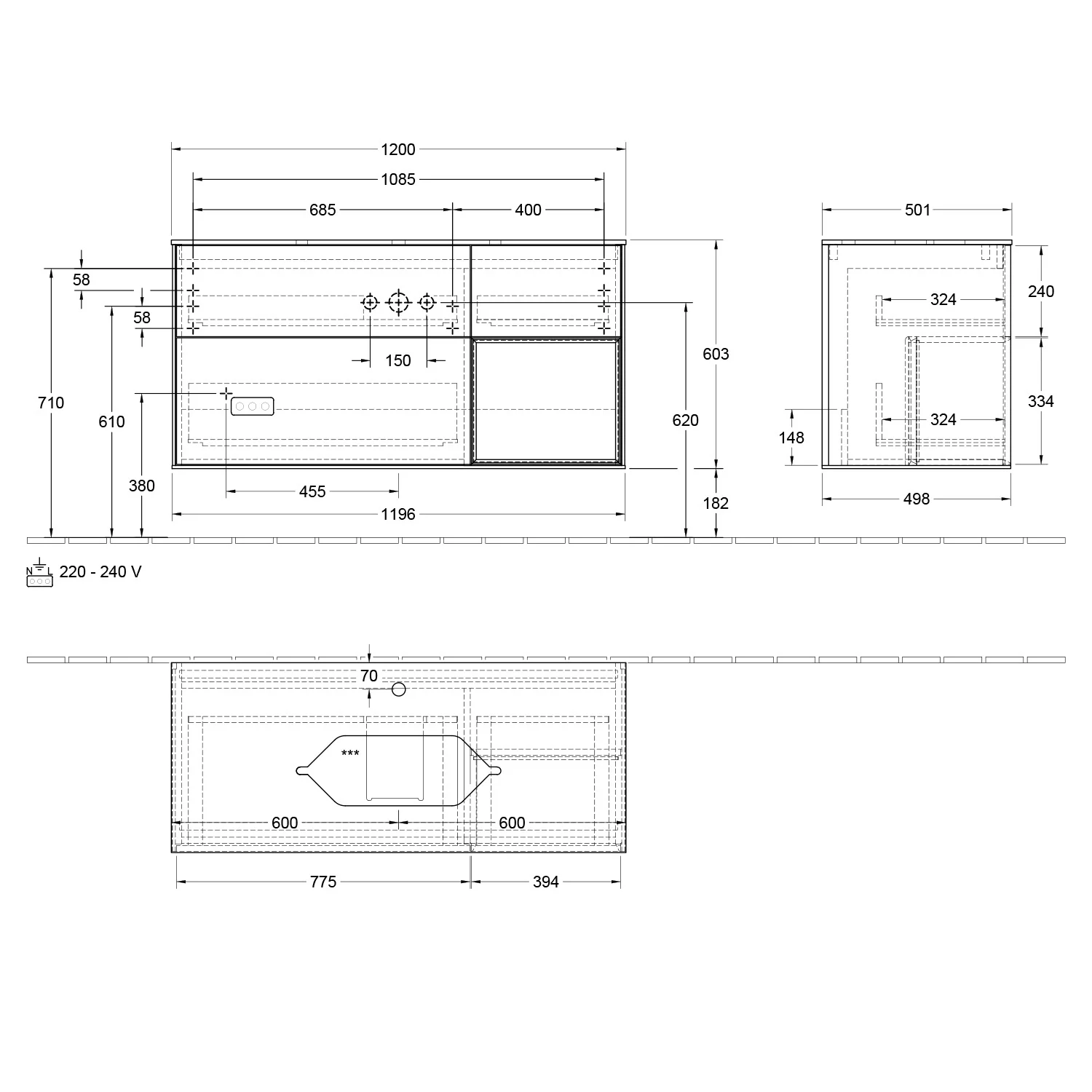 Villeroy & Boch Finion Waschtischunterschrank 120 cm mit Regalelement rechts, Abdeckplatte, Wandbeleuchtung