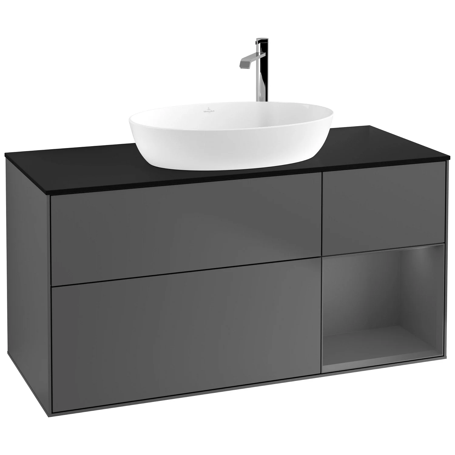 Villeroy & Boch Finion Waschtischunterschrank 120 cm mit Regalelement rechts, Abdeckplatte, Wandbeleuchtung