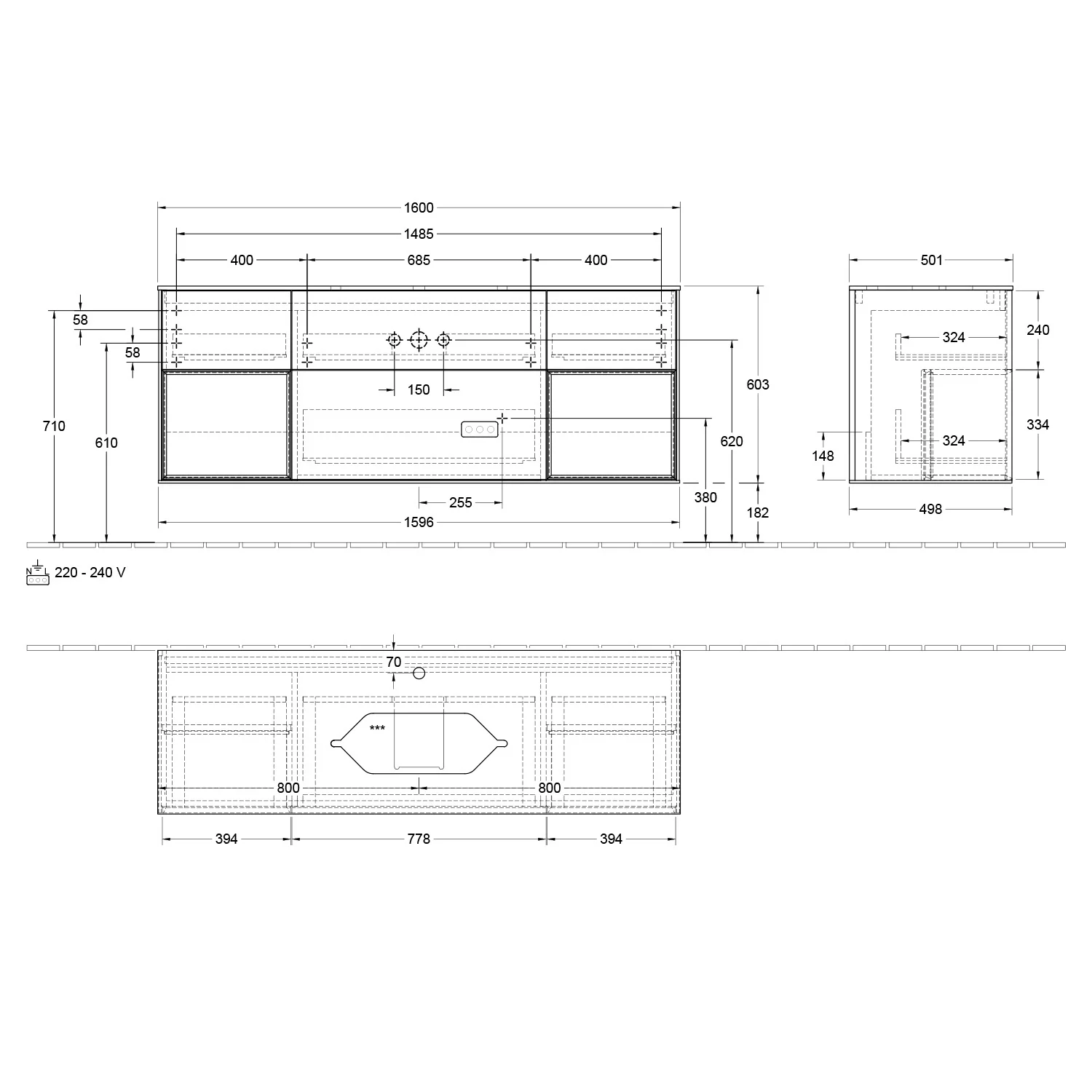 Villeroy & Boch Finion Waschtischunterschrank 160 cm mit 2 Regalelementen, Abdeckplatte, Wandbeleuchtung