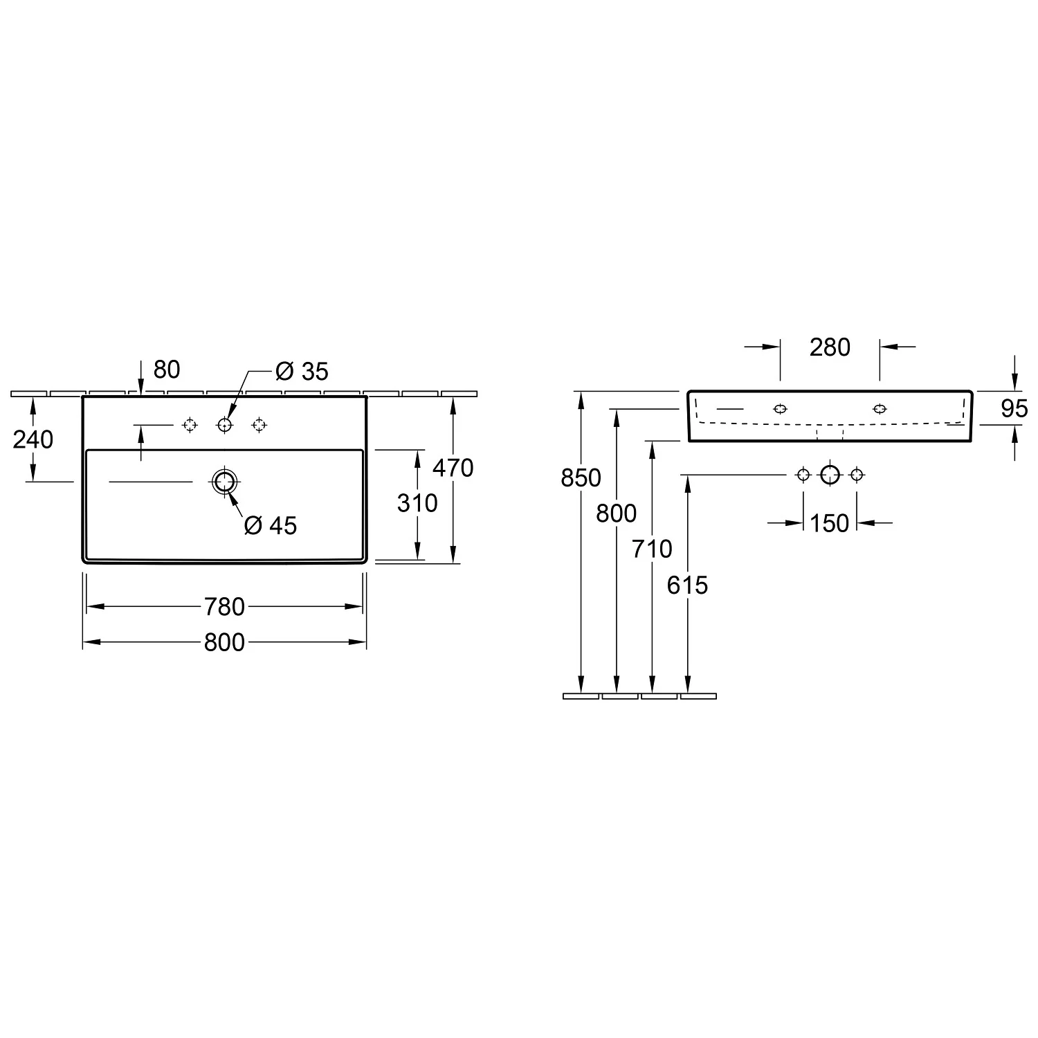 Villeroy & Boch Memento 2.0 Waschtisch 80 cm mit 1 Hahnloch, ohne Überlauf