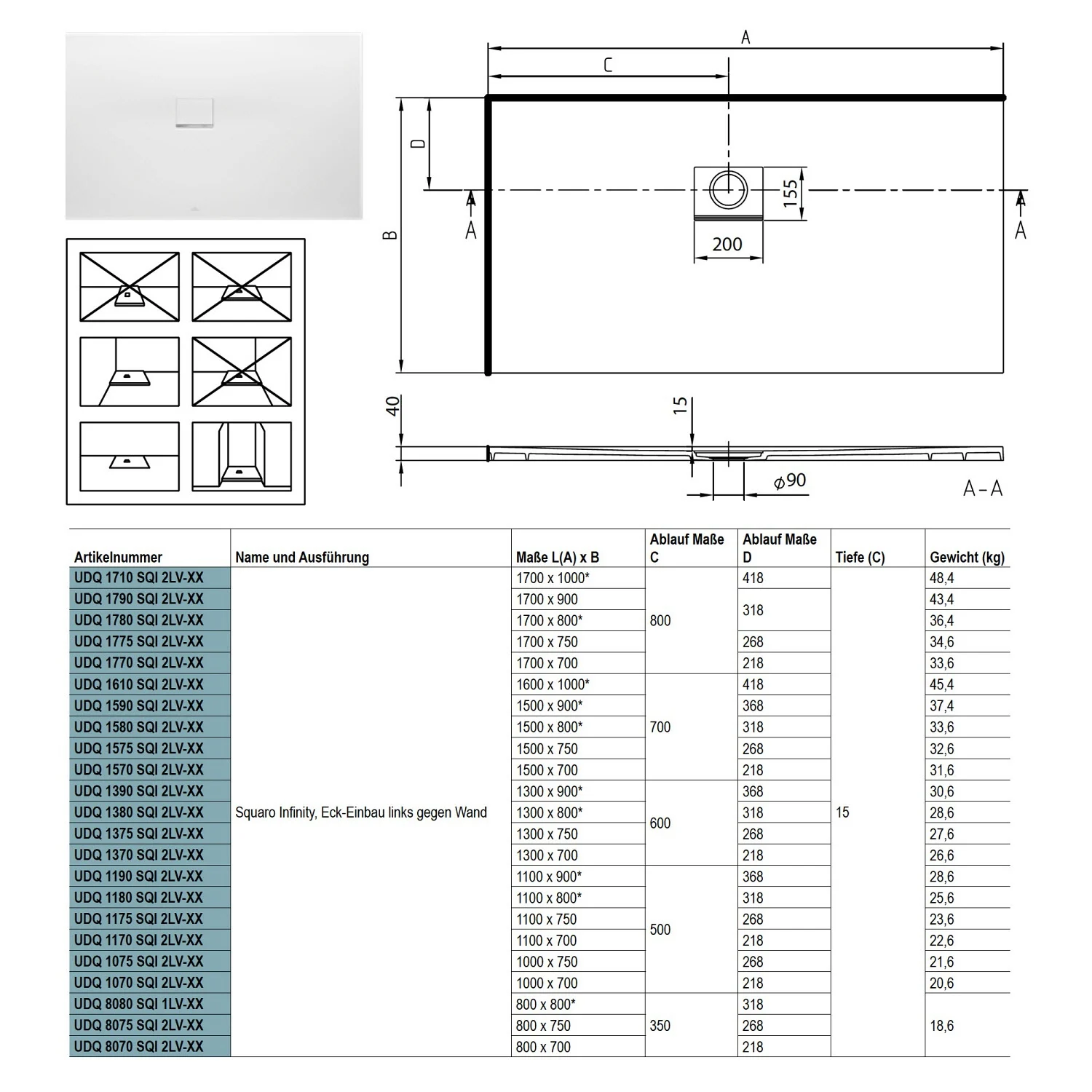 Villeroy & Boch Squaro Infinity Duschwanne 80 x 80 cm für Eck-Einbau links