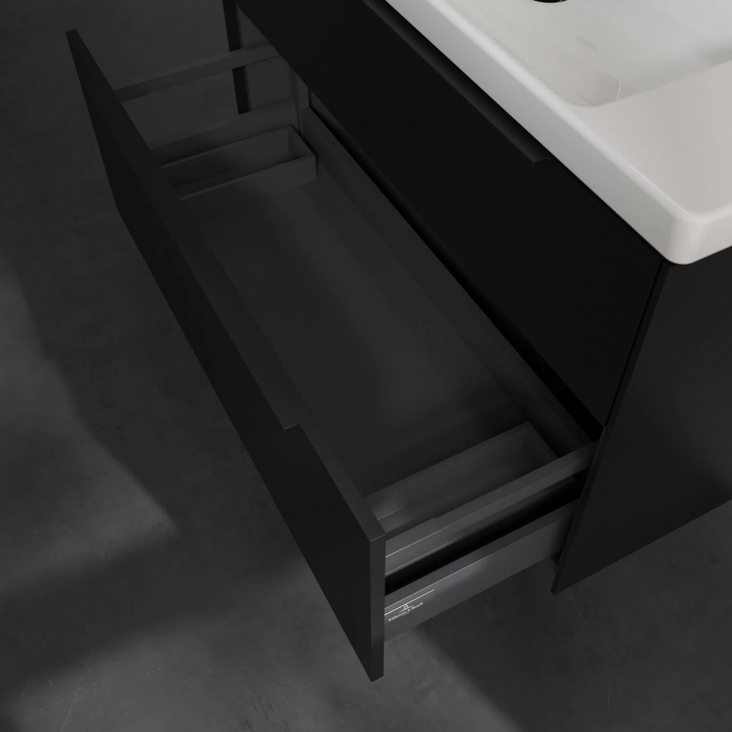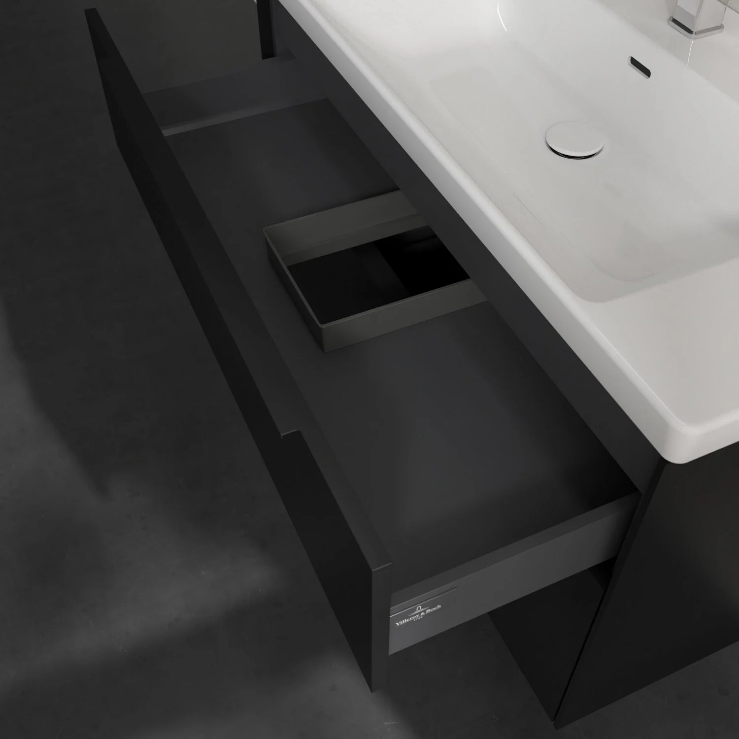 Der Waschtischunterschrank der Kollektion Subway 3.0 von Villeroy & Boch besticht durch gradliniges, zeitloses Design und großzügigen Stauraum. Front und Korpus sind mit einer hochwertigen Direktbeschichtung oder Lackierung, deren Anti-Fingerprint-Oberfläche unschönen Fingerabdrücken vorbeugt, versehen. Zwei voll ausziehbare Schubladen mit rutschhemmenden Böden, Selbsteinzug-Funktion sowie zwei integrierten kleinen Accessory-Boxen bieten extra viel Platz für Pflege- und Hygieneartikel. Die dezente Griffleiste sorgt für einfache Handhabung und bildet einen besonderen Design-Akzent.