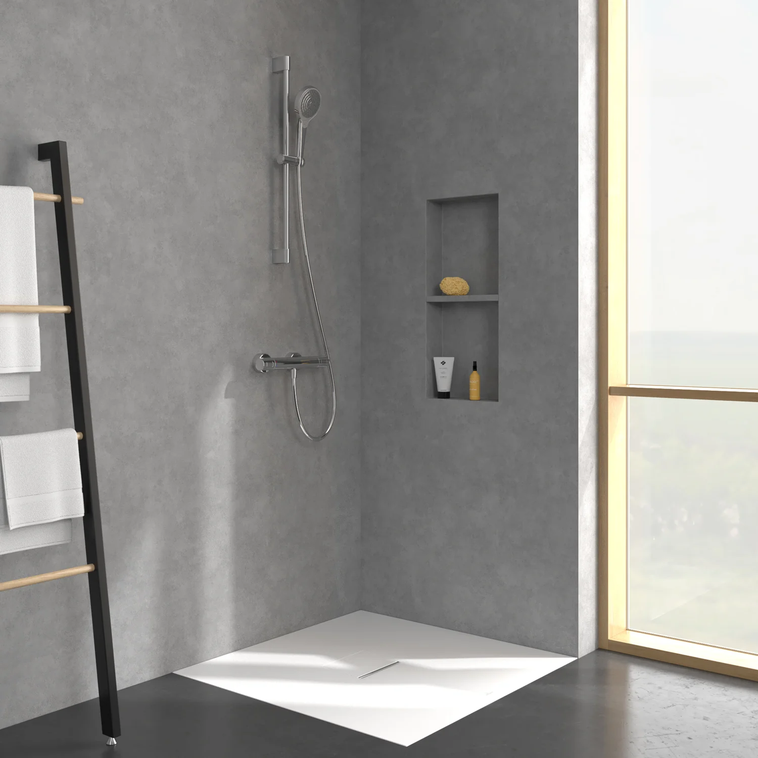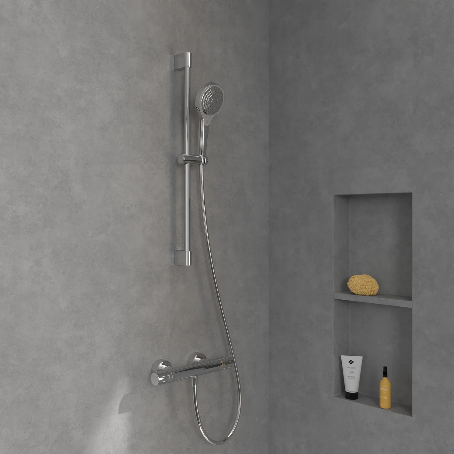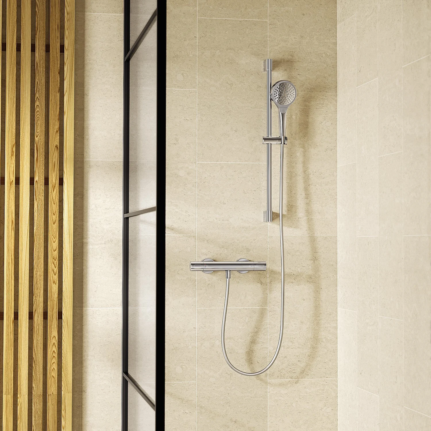 Das Aufputz-Thermostat von Villeroy & Boch aus der Universal Taps Kollektion bietet zahlreiche Komfort-Features, die das Duschen besonders angenehm und sicher machen. So sorgt beispielsweise die innovative CoolTap Technologie dafür, dass die Armatur nie zu heiß wird. Eine zusätzliche Sicherheitssperre bei 38°C Wassertemperatur sorgt für mehr Sicherheit, genau wie die einstellbare Temperaturbegrenzungauf 43°C oder 47°C. Der niedrige Geräuschpegel des Wassers garantiert beim Duschen die nötige Entspannung. Dank des universellen, runden Designs passt das Thermostat ideal zu allen modernen Villeroy & Boch Badkollektionen.