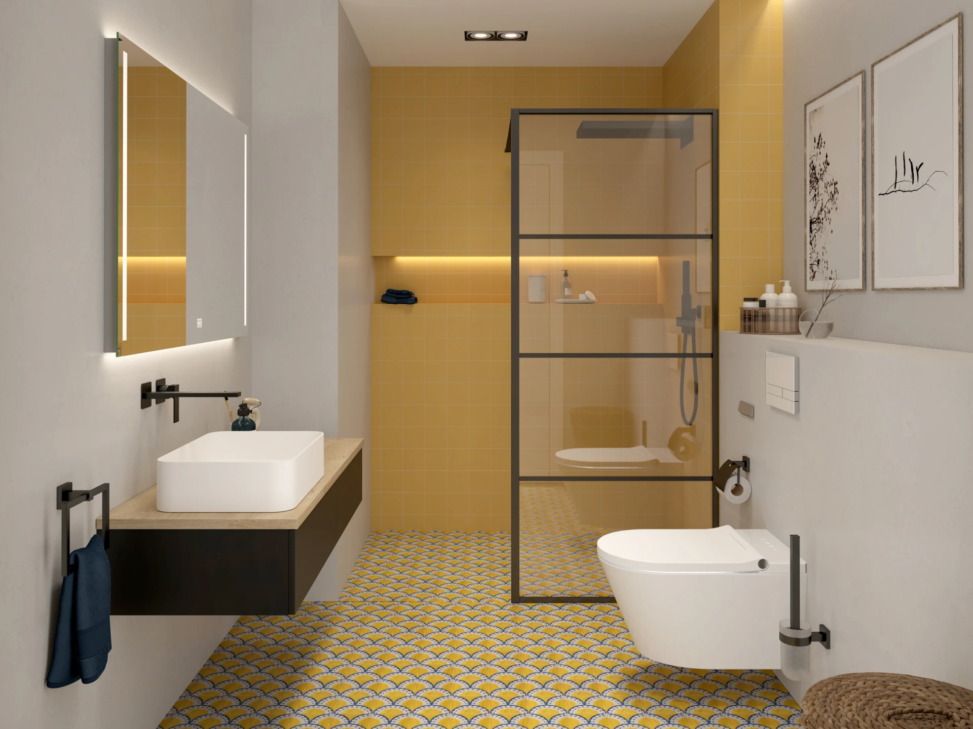 Helle Farben und glänzende Oberflächen reflektieren das Licht und lassen den Raum größer wirken. Nutzen Sie zum Beispiel helle Fliesen, Glas oder Hochglanzmaterialien. Auch ein großer Spiegel kann Wunder wirken, indem er das Licht im Raum verteilt und für eine optische Vergrößerung sorgt. Chrom glänzt besonders schön unter künstlichem Licht. Unsere Chrom-Armaturen für Waschbecken, Duschen und Badewannen sind daher eine ausgezeichnete Wahl für Bäder ohne Tageslicht. Sie verleihen dem Raum einen modernen, eleganten Look und passen zu vielen verschiedenen Stilrichtungen. Unsere Auswahl an Hochglanz-Badkeramiken, wie Waschbecken und WCs, ist ideal für lichtarme Badezimmer. Die glänzenden Oberflächen reflektieren das künstliche Licht und tragen dazu bei, den Raum heller und einladender zu gestalten. Wählen Sie Accessoires, die das Licht reflektieren und den Raum optisch aufwerten. Handtuchhalter, Seifenspender und andere Kleinigkeiten in glänzendem Design sind nicht nur praktisch, sondern auch stilvolle Hingucker.