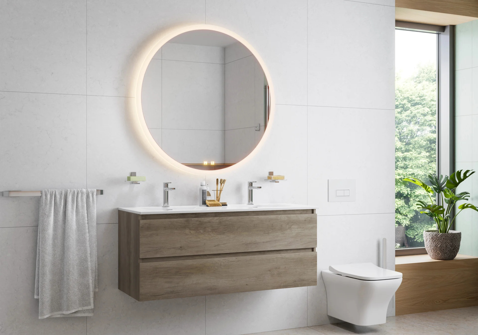 Frische Akzente setzen: Das Doppelwaschbecken mit praktischem Waschtischunterschrank und beleuchtetem Spiegel harmoniert perfekt mit der grünen Pflanze, die die Farbgestaltung des Badezimmers aufgreift. Probieren Sie es selbst aus – Grünpflanzen bringen Leben und Frische in jedes Bad!